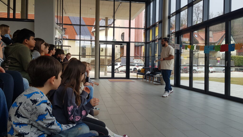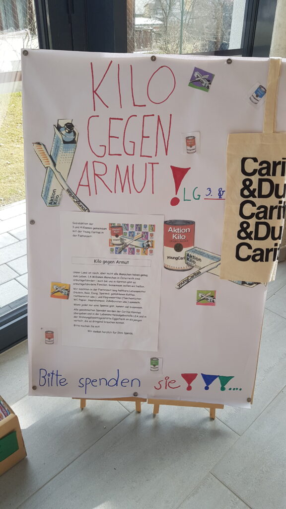 Die Kinder der 4. Klasse haben dazu ein Plakat gestaltet und darin aufmerksam gemacht, dass es Armut auch in Österreich gibt. Die Kinder der 3. Klassen haben bildhaft festgehalten, was man alles an Lebensmitteln sammeln kann. Eingeleitet hat die Sammelaktion ein Vortrag von Mario El Shamy von der Young Caritas, der uns viel über die Arbeit der Caritas und über Armut bei uns erzählt hat.