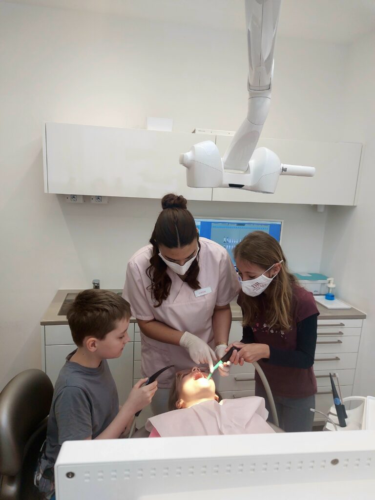 Nach einem kurzen Treffen im Klassenzimmer machten wir uns mit unserer Lehrerin Dorothea Gabriel und Carlas Papa, Herrn Cerny, auf den Weg. In der Zahnarztpraxis wurden wir von Frau Dr. Schönhofer und ihrem Team herzlich empfangen. Es erfolgte gleich eine Gruppeneinteilung, denn wir machten 4 verschiedene Stationen durch.