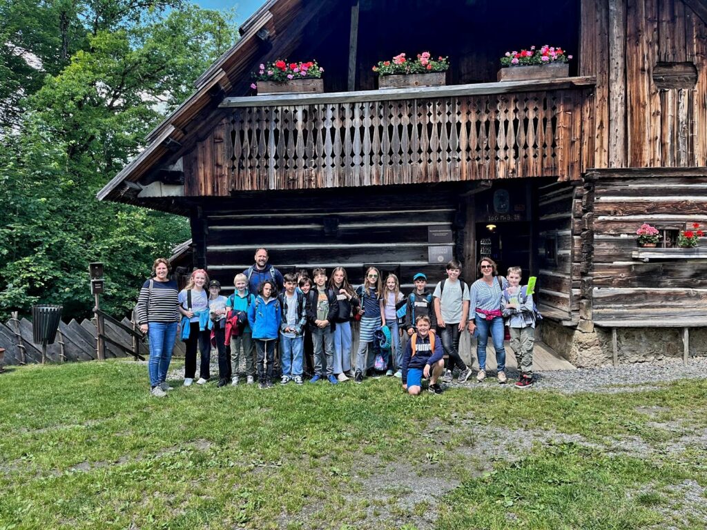 Einige Wochen später war es so weit. Wir trafen uns alle vor dem Schulgebäude. Mein Papa, Stefan Burgstaller, nahm sich für diesen Tag Zeit und begleitete uns. Als alle anwesend waren, spazierten wir gemütlich zum Bahnhof. Unser Zug war schnell da und wir stiegen ein. Nach kurzer Zugfahrt kamen wir nach circa 20 Minuten in Maria Saal am Bahnhof an. Meine Oma erwartete uns bereits. Sie begrüßte uns und erklärte uns gleich den Tagesablauf: „Als erstes gehen wir zum Maria Saaler Dom hinauf, zur Stärkung gehen wir dann ins Dom-Cafe. Wenn ihr dann wieder fit seid, spazieren wir weiter zum Freilichtmuseum.“ Gleich gingen wir los. Wir wanderten einen kleinen Hügel hinauf. Als wir oben waren, schnauften wir ziemlich. Vor dem Dom erwartete uns die ehemalige Volksschullehrerin von meinem Papa, Frau Höfernig. Sie erklärte uns den Dom und erzählte uns viele interessante Sagen und Geschichten. Wir entdeckten den ganzen Dom und fanden sogar die „Teufelsspuren“. Am Ende der Führung durften wir noch beim „Flüsterbogen“, der wie ein Telefon funktioniert, flüstern. Meine Oma stellte nun eine Frage: „Habt ihr Lust auf ein Eis?“ Wie aus einem Munde schrie die ganze Klasse: „Ja!“ Wir genossen das Eis und dann ging es auch schon weiter zum Freilichtmuseum. Wir bekamen eine kurze Führung durch fast alle schönen, alten Bauernhäuser im Museum. Der entscheidende Höhepunkt war dann aber die „Schatzsuche“ durch das ganze Museum. Wir mussten knifflige Aufgaben zu den vielen Häusern lösen. Ein Geheimcode musste entschlüsselt werden, um die Schatztruhe öffnen zu können. Wir schafften es. Die Kiste ging auf. Jeder durfte sich nun einen kleinen Schatz/Stein aussuchen. Anschließend machten wir uns wieder auf den Weg zurück zum Bahnhof.